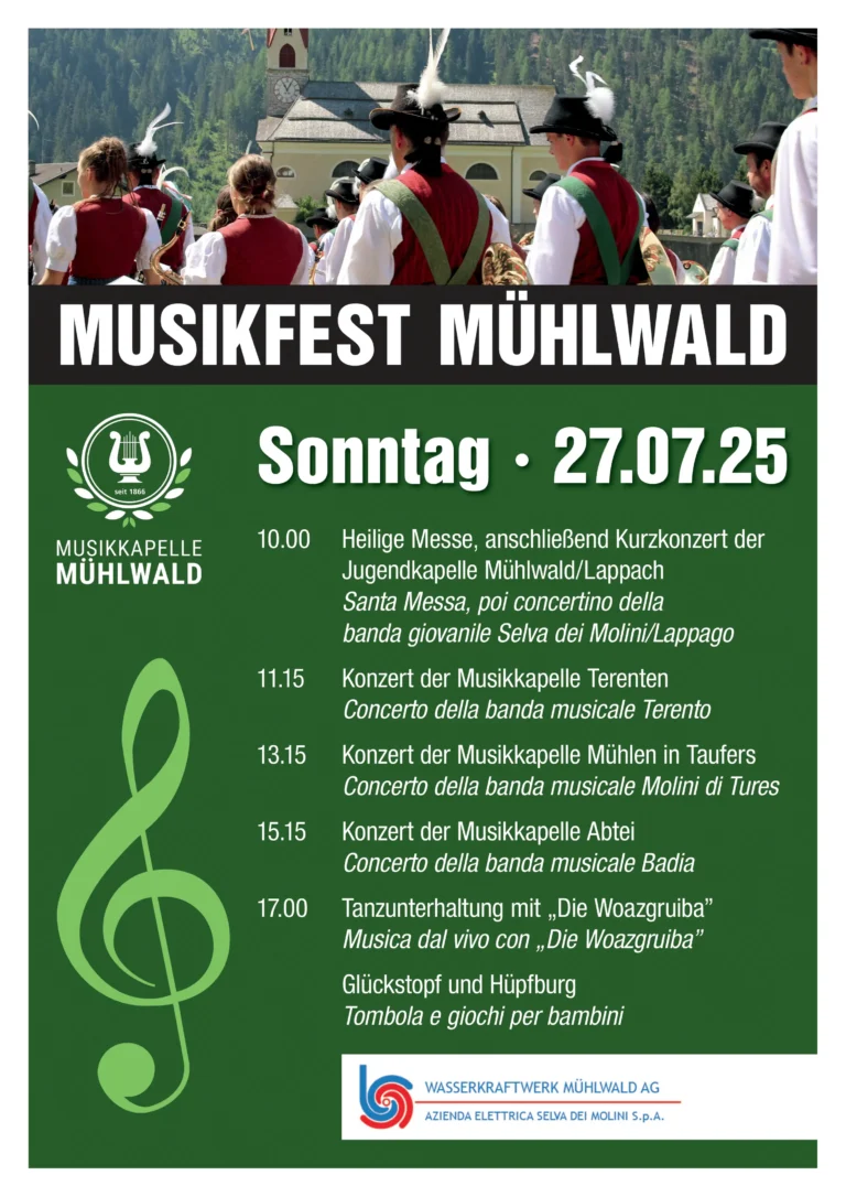 Unser Musikfest ist seit Jahren fester Bestandteil der Musikkapelle Mühlwald, welches meist Ende Juli veranstaltet wird.